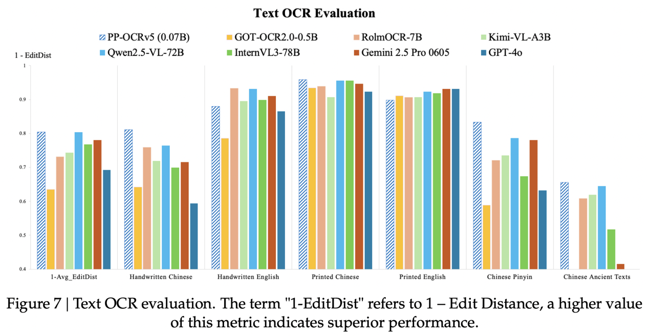 Benchmark 数据显示,PP-OCRv5 在 Printed Chinese、Printed English、Handwritten English 等核心任务上与百亿级大模型 Qwen2.5-VL-72B 精度持平甚至更优;在 Handwritten Chinese、Chinese Pinyin 等复杂场景中,仍稳居前列,表现出强泛化能力。