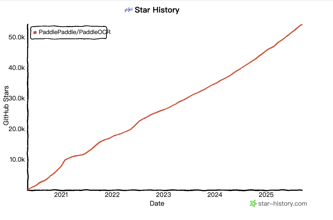 据了解,2025 年 5 月,飞桨团队推出 PaddleOCR 3.0 版本,文字识别方案 PP-OCRv5 与通用文档解析方案 PP-StructureV3,以及原生支持文心大模型 4.5 的智能文档理解方案 PP-ChatOCRv4 共同构成其三大特色能力。自 2020 年开源以来,PaddleOCR 累计下载量突破 900 万,被超过 5.9k 开源项目直接或间接使用,是 GitHub 社区中唯一一个 Star 数超过 50k 的中国 OCR 项目。