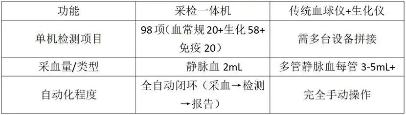 一方面,迈纳士的 Magic Lab 通过「AI 采血+集成检测+智能报告」的一体化设计,与传统「护士采血+外送检测+人工出报」的模式相比,该设备实现从静脉采血、自动检测到报告生成的全流程闭环,总耗时由 1-2 天缩短至约 15 分钟,诊断周期得以大幅压缩。患者仅需 3 分钟即可完成无痛采血,15 分钟内即能够获得包括血常规 20+项、生化 58+项、免疫 20 项的近百项检测结果,报告可即时打印或通过移动端推送,真正实现「随检随走」。
