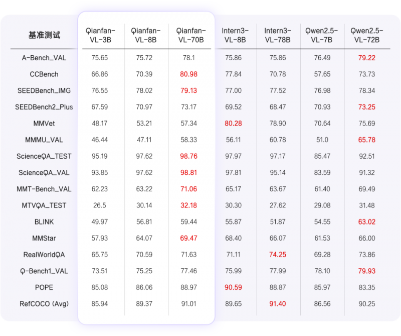 Qianfan-VL 系列模型是由百度智能云千帆模型研发团队,基于开源模型进行开发,并在百度自研昆仑芯 P800 上完成全流程计算任务。昆仑芯 P800 提供了强大的算力支撑,确保模型能够高效处理海量数据与复杂算法,同时支持单任务 5000 卡规模的并行计算。这一结合不仅优化了模型计算的效率,更使得模型在性能表现上达到了新的高度,在通用和垂类任务评测中展现出 SOTA 水平。Qianfan-VL 模型具备三大特点: