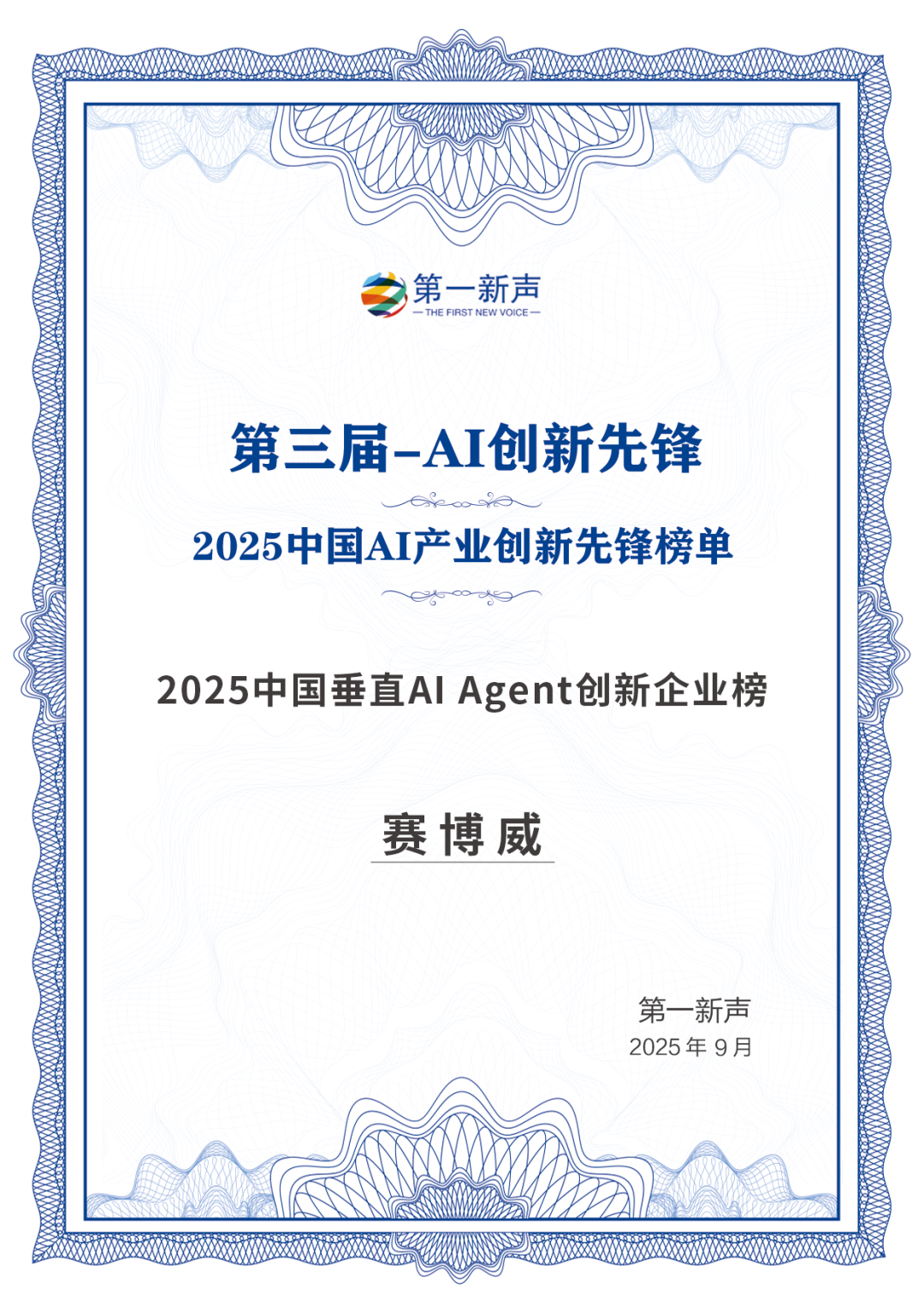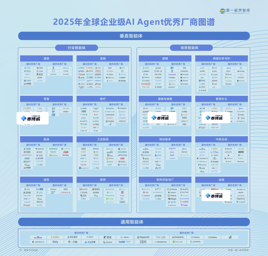 近日,第一新声智库正式发布《2025 年全球企业级 AI Agent 优秀厂商图谱》和《2025 中国 AI 产业创新先锋榜单》,在这两项重磅评选中,赛博威斩获双重肯定,再次彰显了作为 AI 领域创新先锋的出众实力。