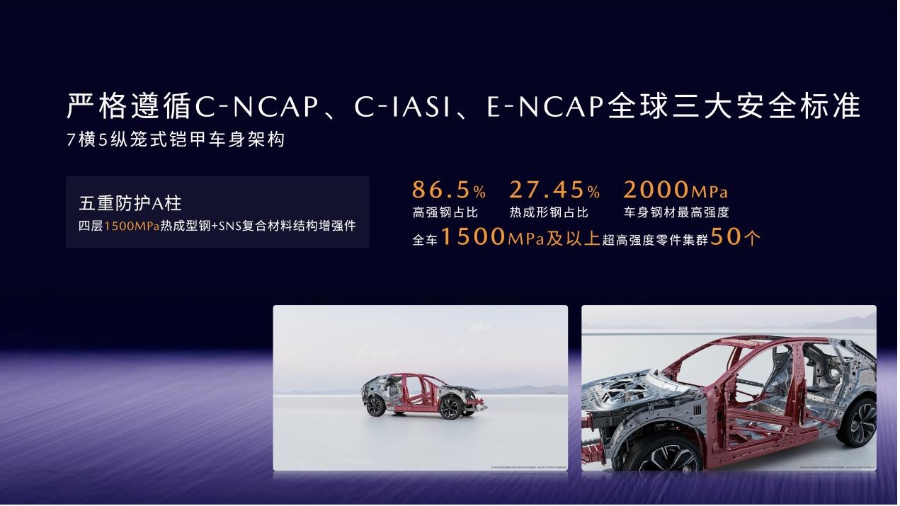 卓越的碰撞成绩来自于车身结构的创新。EZ-60 采用 7 横 5 纵的笼式铠甲结构,高强钢占比 86.5%,热成形钢 27.45%,最高强度 2000MPa,全车 1500MPa 及以上超高强度零件集群 50 个,关键部位更是层层加码,如 A 柱采用五重防护结构,内外双层 1500MPa 热成型钢和腔体 SNS 复合材料,大幅增强 A 柱的钣金强度和刚度,抗弯性能提升 44%。