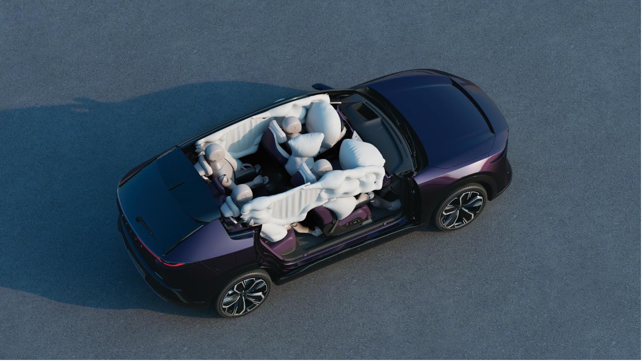 EZ-60 全系标配 9 个安全气囊,总容积 370L,保护面积 26500cm²,双腔中央气囊能防止前排乘员在侧面撞击中发生二次伤害,2 米超长侧气帘从 A 柱覆盖到 C 柱,副驾采用代表行业最高水平的飞跃式气囊,能够在爆炸的瞬间避开大屏。电池系统采用 8 层防护架构,提前满足 2026 年电池安全国标(GB38031-2025)及欧洲标准。