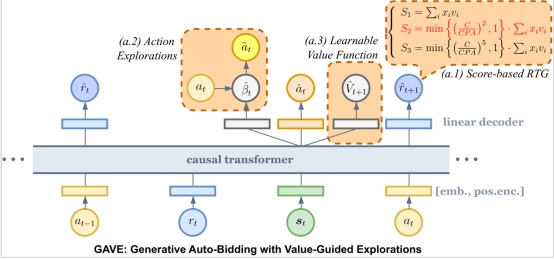 针对这些挑战,快手提出了 GAVE 和 CBD 两大创新算法。GAVE 算法融合了 Score-based RTG 机制与价值函数引导的动作探索策略,显著提升了离线训练中的探索能力,该成果助力团队荣获 NeurIPS 2024 自动出价竞赛双赛道冠军。