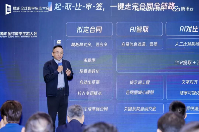 庄丰顺表示,合同作为企业运营中不可或缺的一环,具备完整的上下文,天然适合大模型和 AI 的应用。基于腾讯在合同智能管理上深厚的实践,荣耀和腾讯电子签围绕合同全生命周期,拆解为「起、取、比、审、签」五大环节,用 AI 辅助合同起草、要素提取、对比、审查到电子签署全流程,极大提升了合同管理的效率和质量。