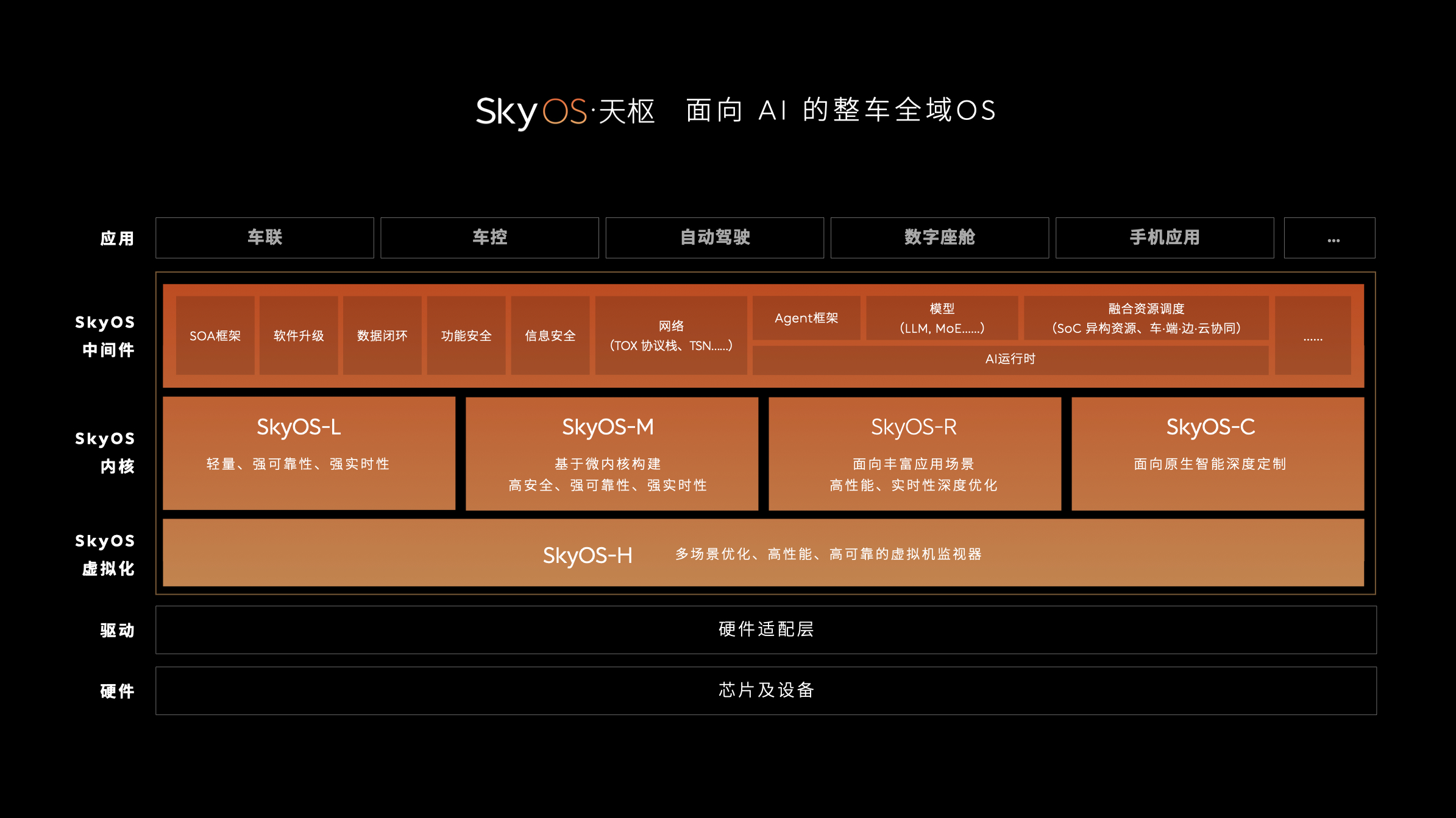 「SkyOS·天枢」在底层打通智能硬件、计算平台、通信与能源系统,实现对车联、车控、智能驾驶、数字座舱、手机应用等全域应用的统一管理与协调,具备高带宽、低时延、大算力与异构硬件、跨域融合、灵活持续进化、高可靠性、信息安全七大特性,是把旗舰级硬件性能转化为全场景领先的体验优势的关键技术底座。
