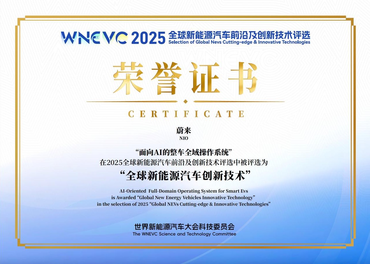 2025 年 9 月 28 日,第七届世界新能源汽车大会在中国海口举办。本届大会上,蔚来整车全域操作系统「SkyOS·天枢」获评「全球新能源汽车创新技术」,由中国工程院院士孙逢春发布,中国科学技术协会主席、世界新能源汽车大会主席万钢颁发荣誉证书,蔚来执行副总裁沈峰代表公司领取。