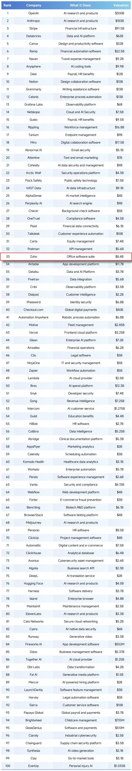 作为 AI+SaaS 领域的领军企业,Zoho 连续多年进入该榜单,今年的表现也十分亮眼,创造了 10 年来的最好成绩,位列第 33 位。