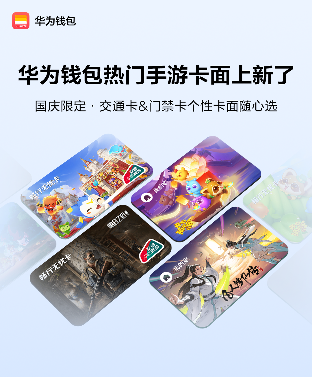此次推出的联名卡面涵盖了多种游戏风格,满足不同华为钱包交通卡及门禁卡用户的喜好。《明日之后》的末日生存风、《凡人修仙传:人界篇》的仙侠风、《开心消消乐》的可爱风以及《洛克王国》的奇幻风,每一款都独具特色。为您的国庆带来"出行+焕新"双重体验!