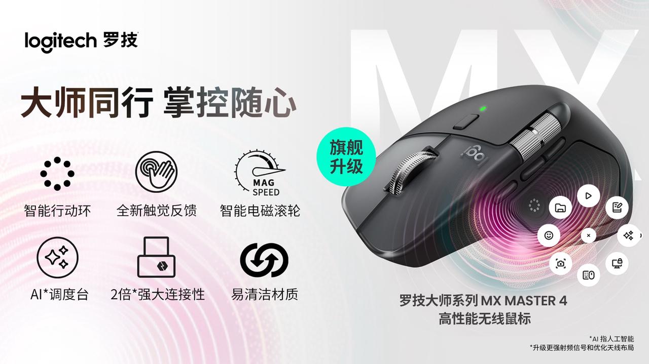 2025 年 9 月 30 日— 罗技今日正式发布罗技大师系列的最新成员 MX Master 4 高性能无线鼠标。这款产品专为创意专业人士、开发者及商务用户打造,依托沉浸式触觉反馈、先进软件支持与强大的连接性能,致力于为操控精度与工作效率树立全新标准,轻松应对复杂工作场景。