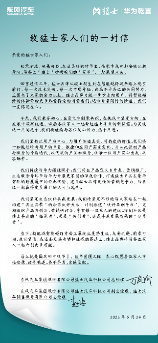 十一前夕,东风汽车集团股份有限公司猛士汽车科技公司总经理万良渝,东风汽车集团股份有限公司猛士汽车科技公司副总经理、猛士汽车销售服务有限公司总经理赵安双双履新,并联手为猛士全体经销商写了《致猛士家人们的一封信》。这封情真意切的「家书」不仅回顾了猛士品牌三年的创业历程,更奏响了猛士品牌三年蓄力再出发的号角,坚定了以用户为中心、与华为深化合作、构建伙伴生态三大方向,共同推动猛士品牌在智能越野新征程上行稳致远。