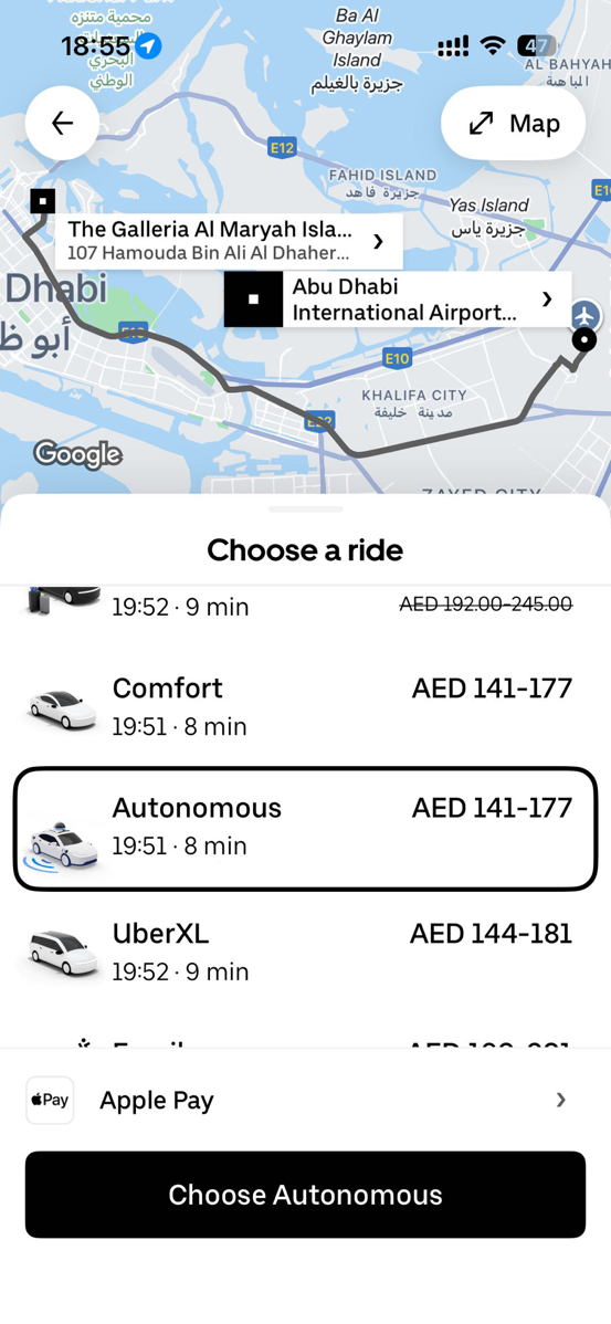 阿布扎比的 Uber 用户可直接通过「Autonomous」服务呼叫文远知行的 Robotaxi GXR。该车型最多可容纳五名乘客,车费与「Comfort 服务」保持一致。