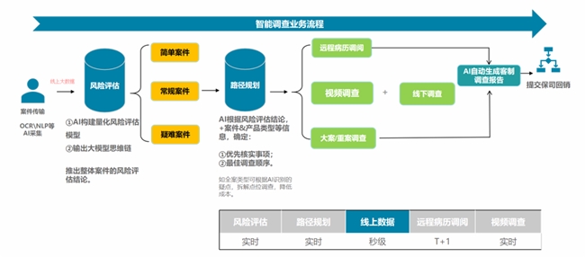 实践中,超过 70% 的案件被判定为简单及常规案件。针对这类案件,可依托 AI 精准提调智能体、远程病历调阅网络与空中视频面访等线上能力,实现最快 1 天结案,显著提升调查效率与控费效果。