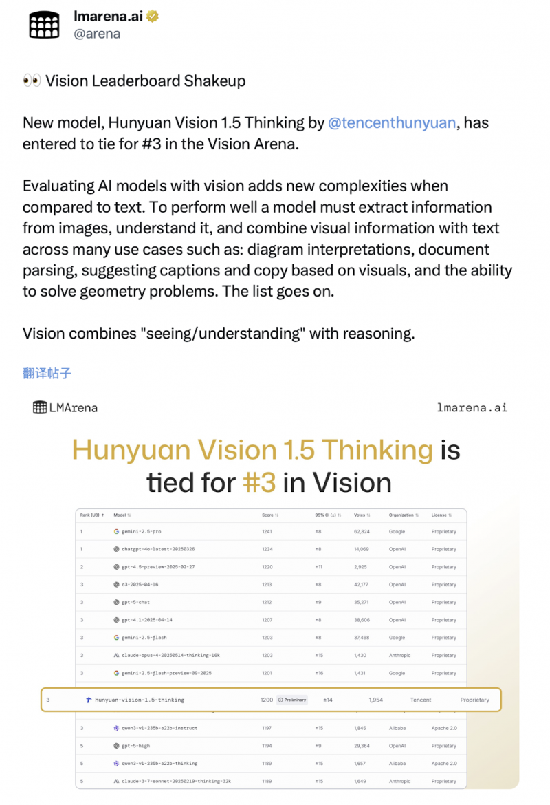 10 月 7 日,国际大模型竞技场 LMArena 发布最新视觉模型榜单,腾讯混元最新视觉模型 Hunyuan-Vision-1.5-Thinking 表现抢眼,取得全球第 3,国内第 1 的好成绩。