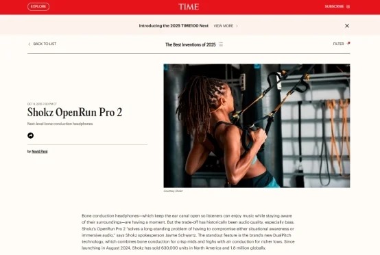 近日,《TIME》(时代周刊)公布 2025 年度最佳发明榜单,韶音 OpenRun Pro 2 凭借突破性开放式声学技术、卓越的音质表现,及舒适佩戴体验荣登榜单,成为本年度音频领域备受瞩目的创新产品之一。