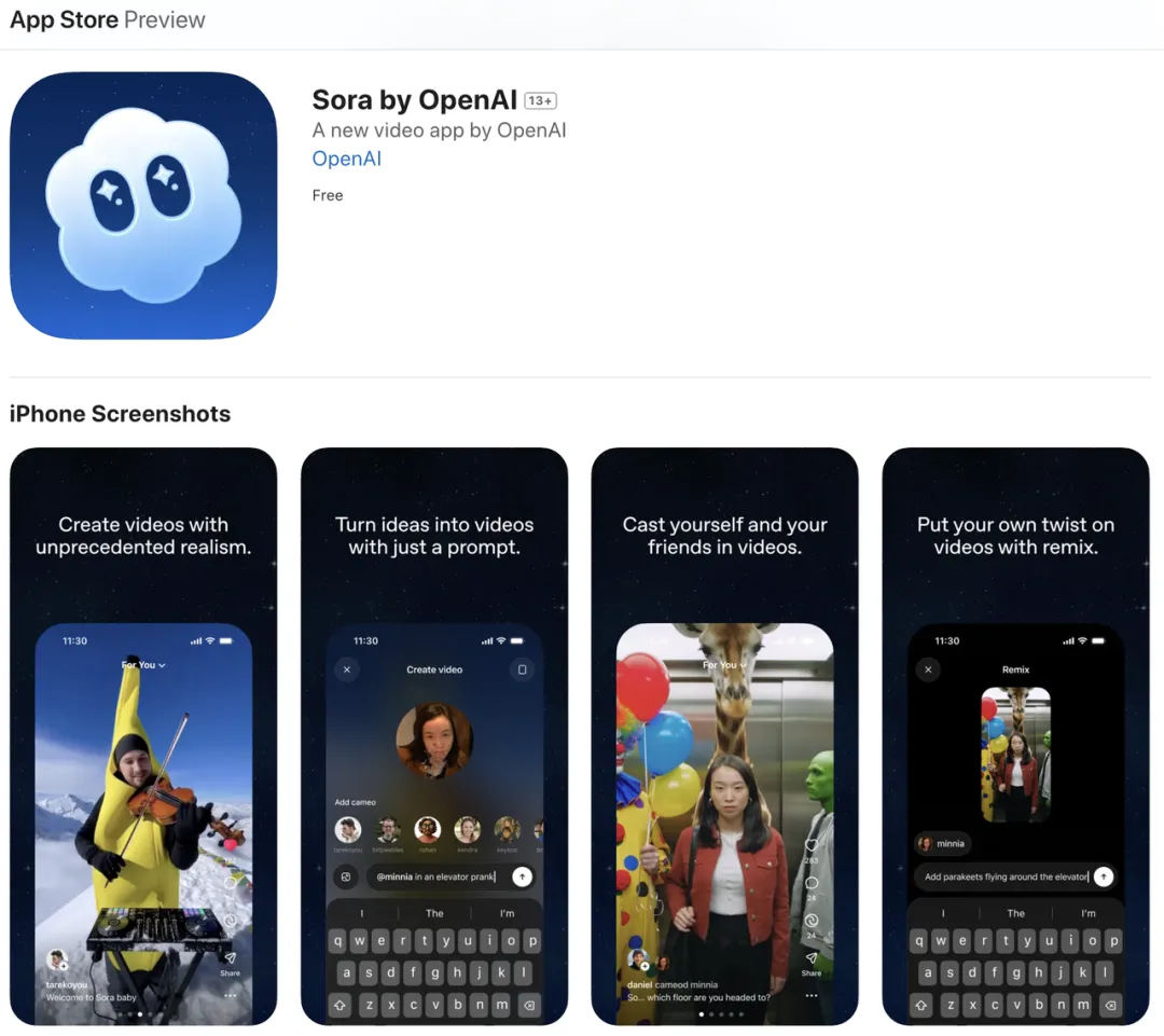 OpenAI 推出名为 Sora 的 AI 短视频应用|图片来源:Apple Store