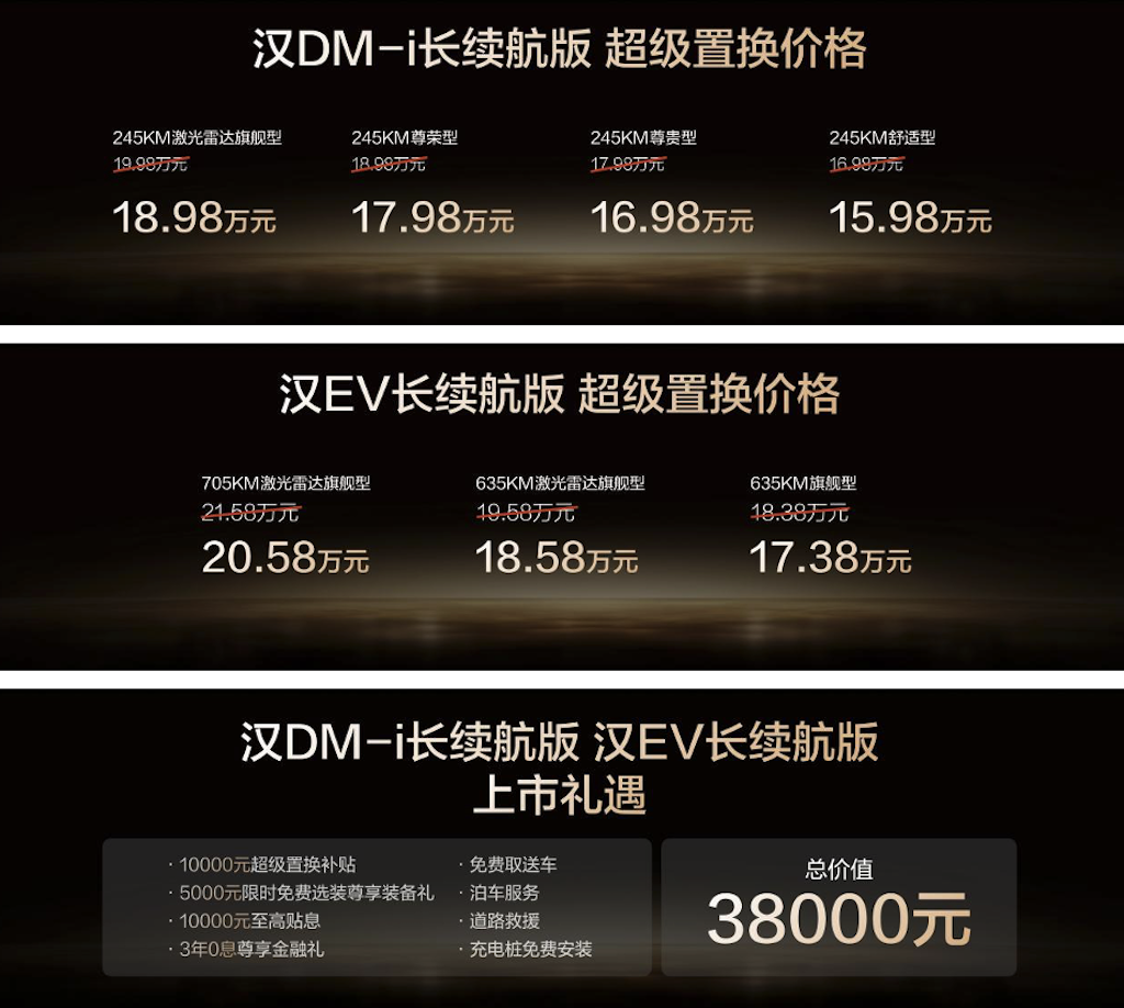 此次,汉 DM-i 长续航版共推出 4 款车型,补贴后售价 15.98 万~18.98 万元;汉 EV 长续航版共推出 3 款车型,补贴后售价 17.38 万~20.58 万元(10 月 31 日前完成购车可享 1 万元超级置换补贴)。同时,比亚迪还为用户准备了包含置换补贴在内的至高价值 3.8 万元七大礼遇。