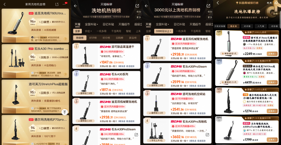 其中,追觅 T60 Ultra 洗地机登陆京东家用洗地机金榜 Top 20、抖音商城洗地机爆款榜 Top 5,成为该榜单唯一一个高端旗舰级产品,成为高端洗地机品类中备受用户信赖的代表作。追觅 T50 Ultra 则双双获得天猫洗地机热卖榜及 3000 元以上洗地机热销榜 Top 1。