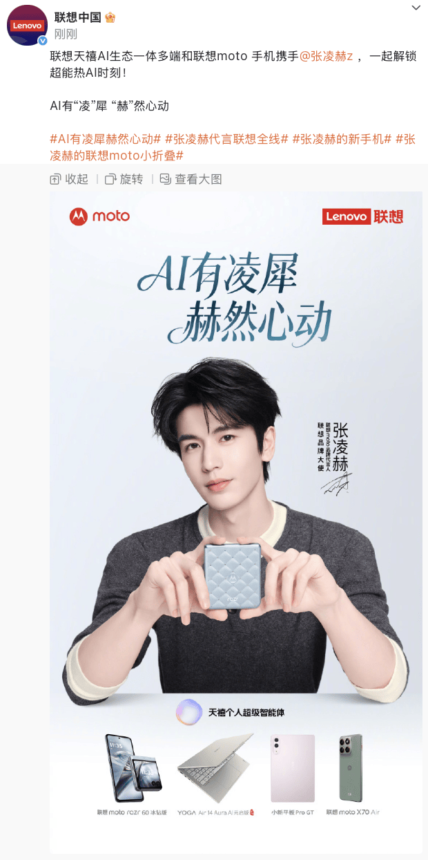 10 月 14 日,联想宣布张凌赫正式担任联想品牌大使及联想 moto 品牌代言人,双方将携手诠释联想 moto AI 手机、联想 AI PC 及联想 AI 平板等产品,与广大用户一同探索更智慧、更贴心的智能生活体验。