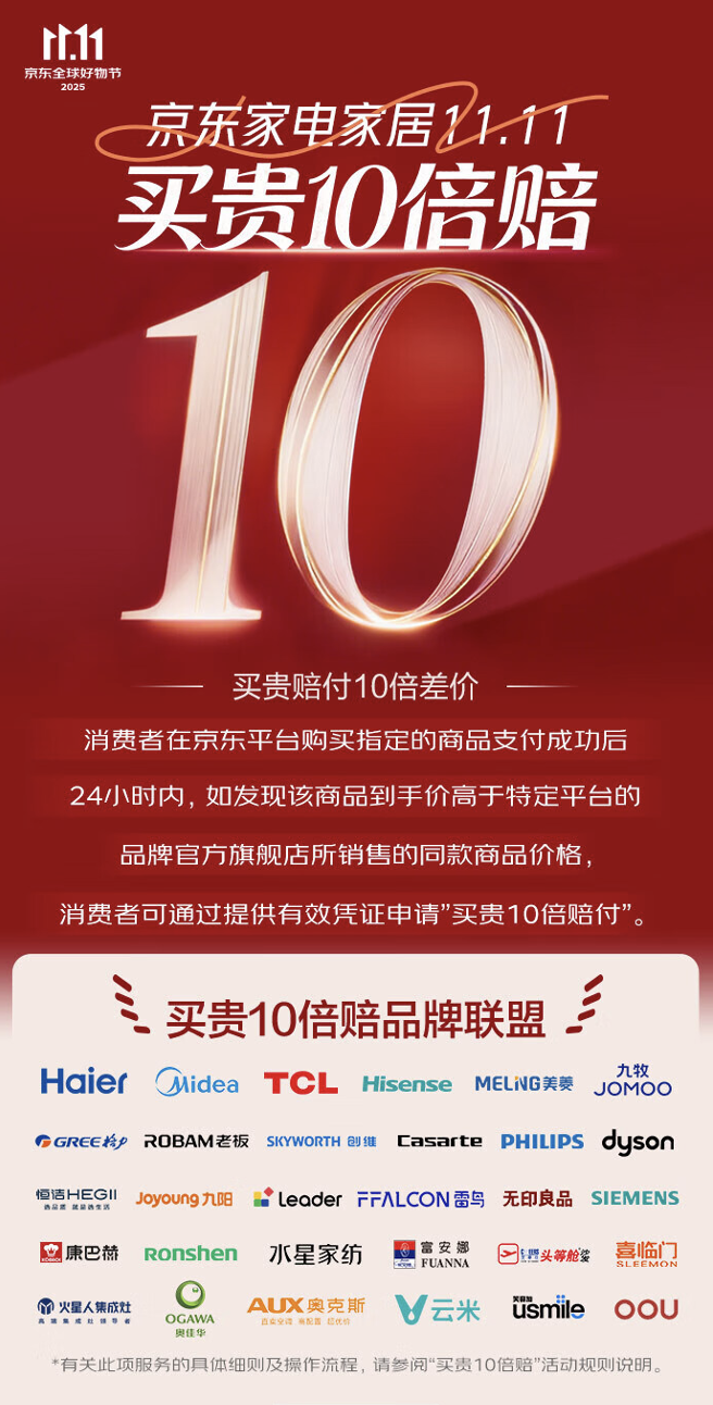 京东「买贵 10 倍赔」以最直接的方式,为消费者构筑了坚实的价格信任防线,让用户无需比价,即可轻松选购品质过硬、价格优惠的商品。这不仅是对购物体验的升级,更是推动 11.11 大促回归「让利用户、服务用户」初心的关键一步。