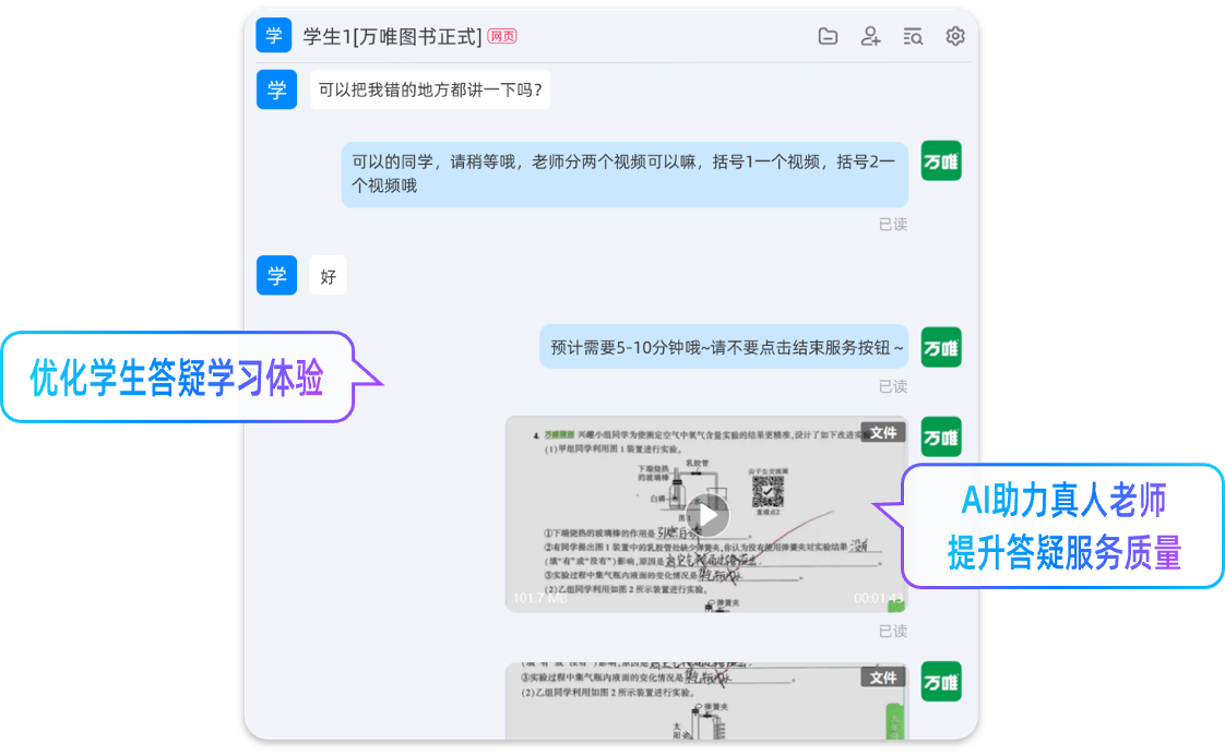 万唯每年研发原创好题超 20 万道,专版中考图书服务全国 28 省(市、区),是国内教辅领域的领军企业,始终以创新为核心驱动力,持续推动教育服务迭代升级。面对 AI 浪潮,万唯确立了全方位的 AI 战略布局:在 K12 领域通过 AI 打造智能答疑服务平台,构建专属答疑知识库,提升真人老师答疑服务质量,同时优化学生的个性化答疑和学习体验。