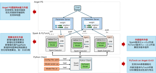 发布 PyTorch on Angel 0.4.0 版本,该版本中支持了异构图图神经网络算法,如: GATNE;解耦 GAMLP 算法以提升计算效率;将 Python Client 内嵌到 Angel 框架中,提供模板化配置,提升了框架的易用性,降低用户的使用门槛。