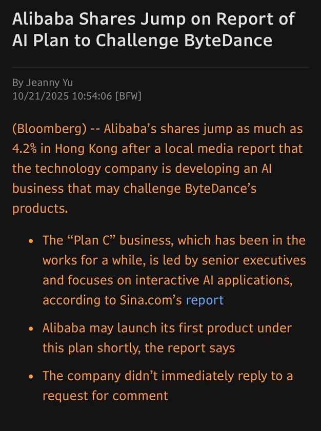 据彭博社报道,阿里巴巴在香港股价一度上涨 4.2%,此前有本地媒体报道称,这家科技公司正在开发一项 AI 业务,或将对字节跳动的产品构成挑战。