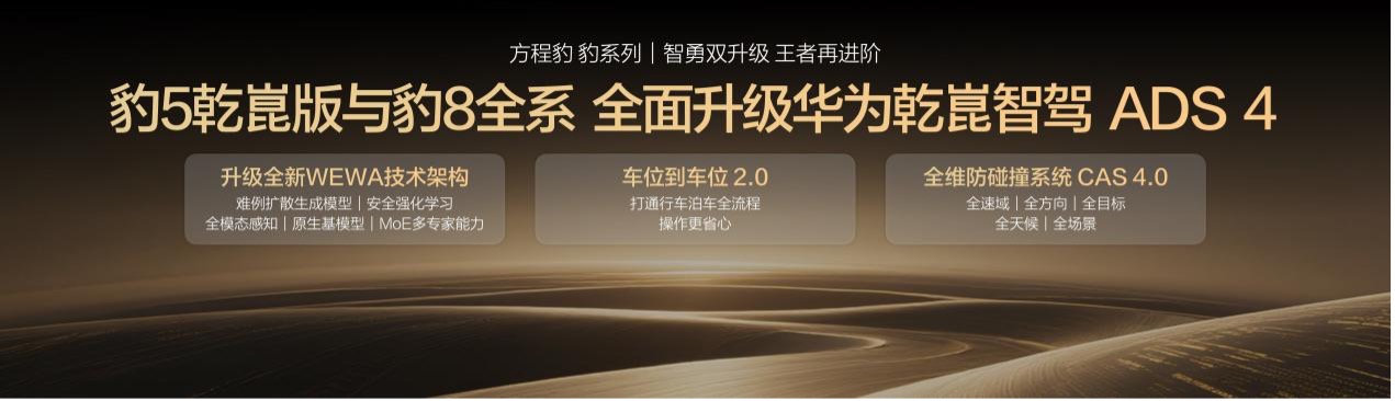豹 5 乾崑版及豹 8 全系将升级华为乾崑智驾 ADS 4,实现了从类人驾驶到超人驾驶的重大升级。首先,升级全新 WEWA 技术架构,让辅助驾驶可以云端自主学习进化,越用越丝滑;车位到车位功能也升级至 2.0 版本,打通了行车到泊车的全流程,全程衔接无缝,操作更省心;此外,还有全维防碰撞系统 CAS 4.0,可以覆盖全路况、全天候,安全制动更快更灵敏,让长途驾驶不再疲惫,让城市通勤安全又轻松。