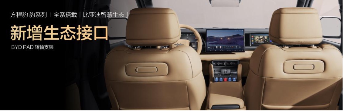 豹 5 长续航版、豹 8 大五座版上市即搭载钛 7 同款比亚迪智慧生态,通过生态设备的「全能管家」比亚迪智慧物联 APP,无需复杂操作,也不需要手动连接多个设备,语音指令即能控制全车所有的生态产品。此外,两款新车型的前排座椅背后均加装了生态接口,插入转轴支架后,可以搭配 BYD Pad 使用。未来将有更多的生态产品,通过生态接口提供用户以智慧互联的无限体验。