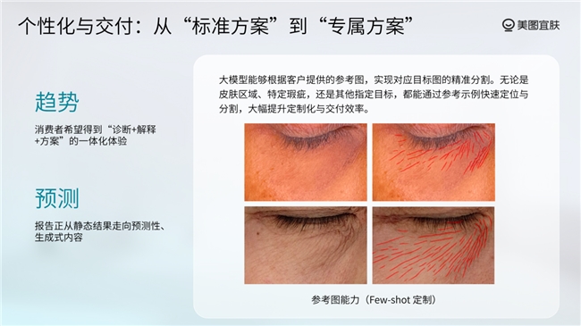 针对美业测肤领域定制化能力不足痛点,美图宜肤推出美业 AI 大模型,通过三大核心能力将测肤从「一次性服务」转化为可沉淀的「长期资产」,为品牌提供精准高效的个性化交付支持。