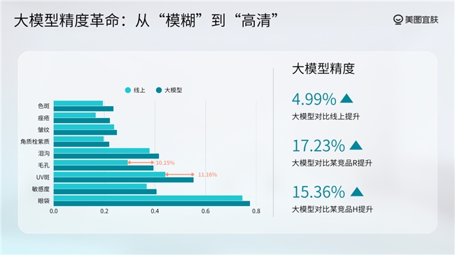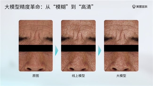 而美图宜肤 AI 美业大模型将测肤维度从「点」拓展至「面」,一次性覆盖 30 余个皮肤检测维度,且基于大规模异构数据训练,具备跨光线、跨肤质、跨设备的稳定性。
