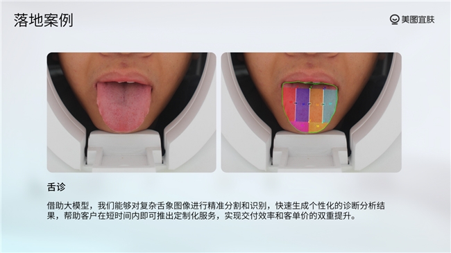 在痘坑检测场景,通过大模型驱动小模型训练,精准识别痘坑区域,结合报告深度解读,把检测结果转化为顾问可讲、用户能懂的差异化价值,显著提升客单价;在舌诊分割场景,能够对复杂舌象图像进行精准分割和识别,快速生成个性化的诊断分析结果,帮助客户在短时间内即可推出定制化服务,实现交付效率和客单价的双重提升。