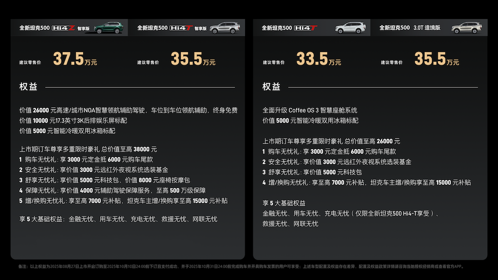 全新坦克 500 定位全场景智能豪华越野 SUV,推出 Hi4-Z、Hi4-T 及 3.0T V6 燃油三种动力版本,其中 Hi4-Z 智享版 37.5 万元,Hi4-T 智享版 35.5 万元,Hi4-T 基础版 33.5 万元,3.0T 造境版 35.5 万元,相比预售价格更具吸引力。