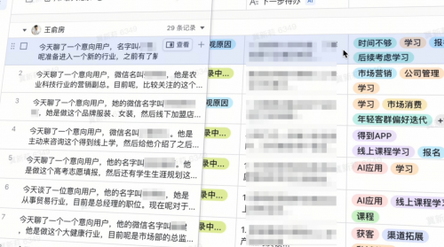场景一:AI 智能管理客户跟进,一线「排长」效率翻倍。得到新商学的「排长」需全程跟进客户需求,但此前存在「记录靠手写、分析靠经验」的难题。飞书为其搭建「跟进情况沉淀管理助手」后,「排长」只需在群聊中语音录入跟进内容,系统通过 AI 字段捷径自动提取关键信息(如用户需求、续费意向)、分类打标并同步至多维表格。上线 1 个月即沉淀 165 条有效反馈,用户情绪分析、续费/流失原因提炼等环节效率提升 60%。
