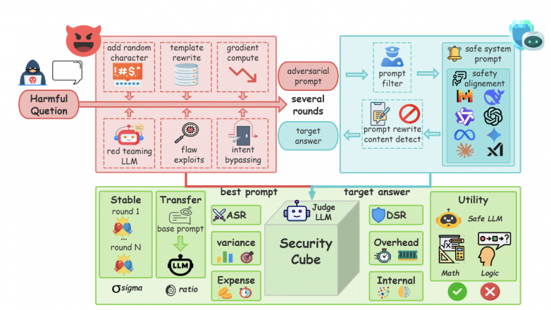 大型语言模型在通用智能方面取得显著突破,但现实世界的越狱(jailbreak)等攻击会诱导模型输出不当内容,威胁高风险应用中的安全、合规与信任。现有评估多依赖单一的攻击成功率等指标,难以反映攻击可复现性、跨模型与跨防御的普适性,以及对模型内部机制的实质性影响,导致安全治理缺乏统一、可比较的评价基准。