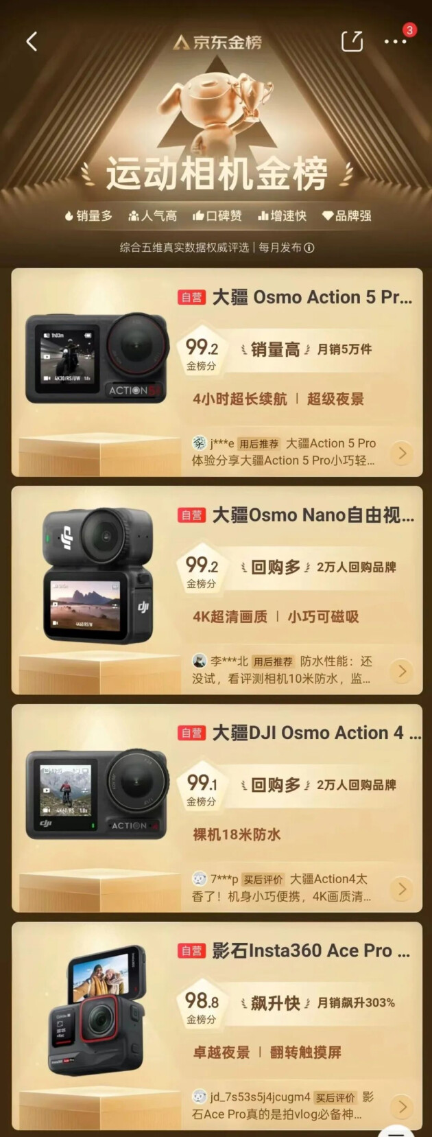 最近京东「运动相机金榜」出炉,大疆又赢麻了!