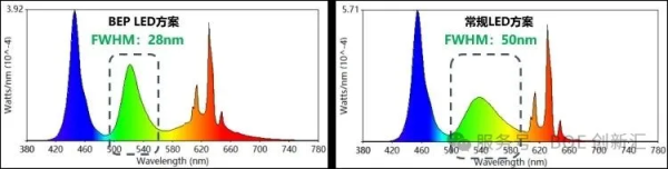 绿色半波宽对比 (BEP LED vs 常规 Blue LED)
