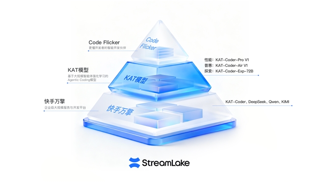 10 月 23 日,快手旗下技术商业化品牌 StreamLake 正式发布其全新的 AI 编程产品矩阵,以「工具+模型+平台」三位一体的战略布局,全面进军 AI Coding 领域。本次推出的产品组合包含智能开发伙伴 CodeFlicker、自研的高性能编码模型 KAT-Coder,以及企业级大模型服务平台快手万擎(Vanchin)。三者协同构建了一个高效、闭环、普惠的 AI 编程新生态,旨在为广大企业与开发者带来颠覆性的研发体验。