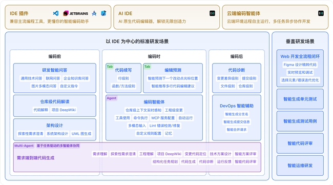 CodeFlicker 的能力贯穿软件开发生命周期,从编码前的智能问答与架构设计,到编码时的代码补全与智能体辅助,再到编码后的代码诊断和智能运维,为开发者提供无缝的 DevOps 端到端赋能。