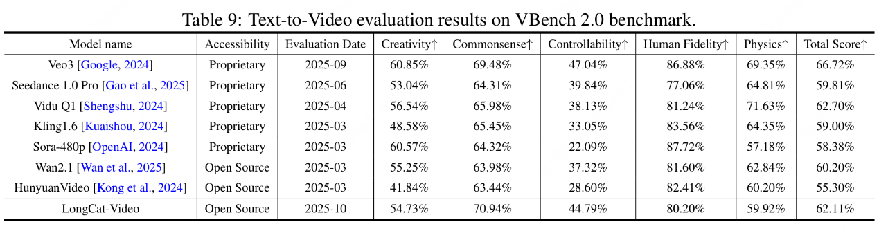 技术报告还称,LongCat-Video 的模型评估围绕内部基准测试和公开基准测试展开,覆盖 Text-to-Video(文本生成视频)、Image-to-Video(图像生成视频)两大核心任务,从多维度(文本对齐、图像对齐、视觉质量、运动质量、整体质量)验证模型性能:136 亿参数的视频生成基座模型,在文生视频、图生视频两大核心任务中,综合性能均达到当前开源领域 SOTA 级别;通过文本 - 视频对齐、视觉质量、运动质量、整体质量四大维度评估,其性能在文本对齐度、运动连贯性等关键指标上展现显著优势;在 VBench 等公开基准测试中,LongCat-Video 在参评模型中整体表现优异。