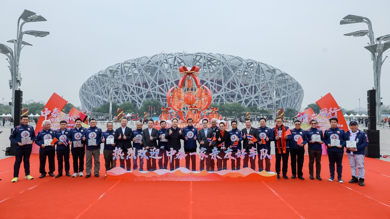 在彩狮翻腾的热烈氛围中,「中泰建交 50 周年友谊之旅」车队缓缓驶入北京奥林匹克公园庆典广场,拉开本次庆祝活动的帷幕。欢迎仪式中,中国人民对外友好协会会长杨万明与泰国前副总理、泰中友好协会会长功・塔帕朗西(Korn Dabbaransi)先后发表致辞,积极评价了这段跨越山海的友谊征程。随后,车队队员被授予纪念证书,并与中泰各界友好人士合影留念,为这场庆祝中泰建交 50 周年的标志性活动留下动人瞬间。