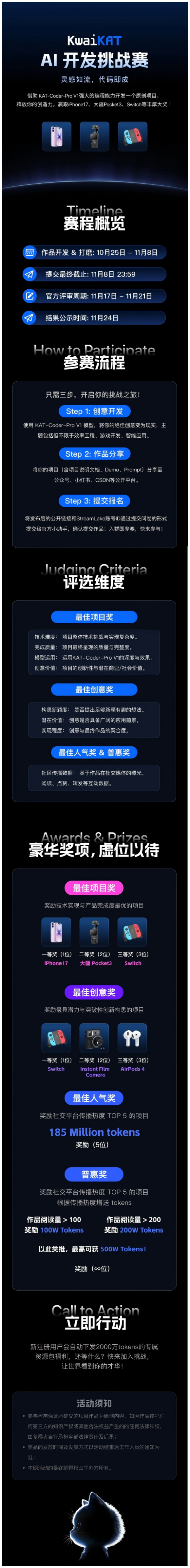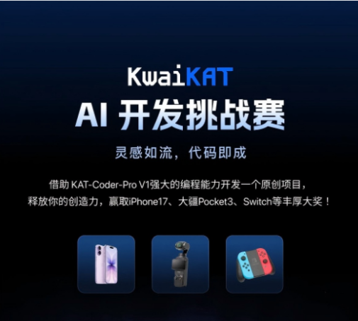 近日,快手 KwaiKAT 宣布开启「AI 开发挑战赛」,面向开发者群体征集基于 KAT-Coder-Pro V1 模型开发的原创项目。参赛者将借助该模型强大的编程能力释放创造力,优胜者可斩获 iPhone17、大疆 Pocket3、Switch 等重磅奖品,同时获得技术展示与行业交流的优质平台。这一赛事是 KwaiKAT 助力开发者成长、构建 AI 开发生态的全新举措,旨在为技术创作者提供将创意落地的工具与资源支持。
