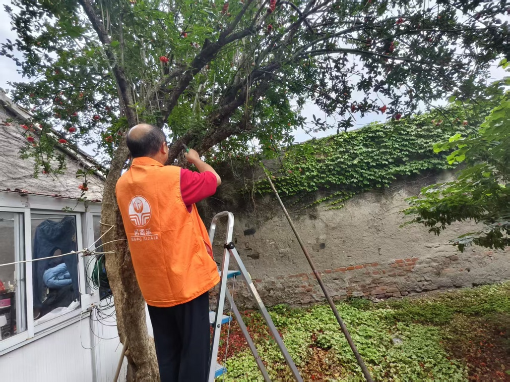 图说:姑苏区石幢新村「居家乐」养老服务中心工作人员通过「时光家园」平台接单,帮助居民修剪果树