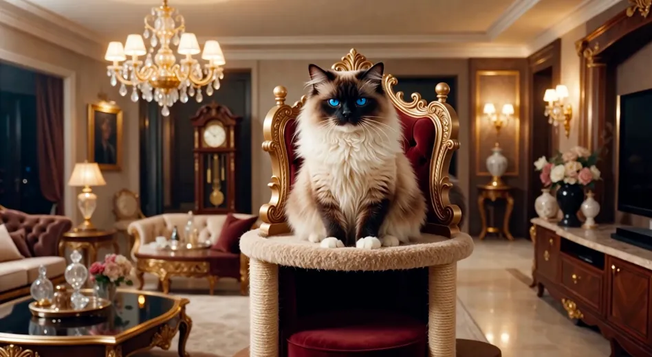 提示词:电影感仰拍镜头,让主体显得很有权势。在一间奢华的客厅里,一只雍容华贵的布 偶猫坐在一张王座般的猫爬架上。它用居高临下、充满审判意味的蓝色眼睛俯视着镜头。它缓缓抬起一只毛茸茸的爪子,以一种极度鄙视的表情指向观众,质问说:「嗯?那我再问你,我生成视频的音频不自然吗?回答我!Look in my eyes!Tell me, why?Why baby why?」。戏剧性的华丽光影,浅景深,超精细的毛发细节,照片级真实感。