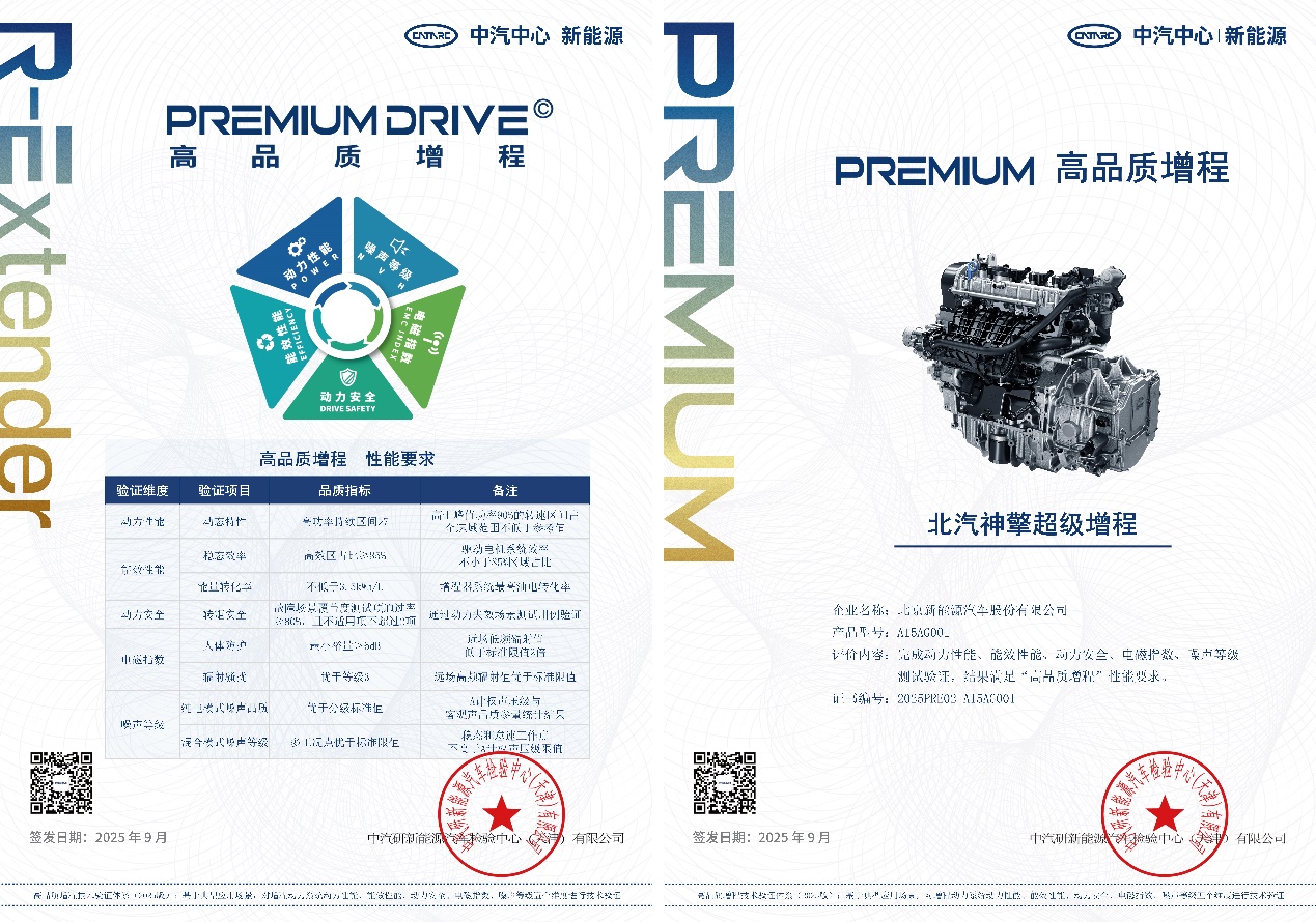 据了解,北汽神擎增程动力历经三轮次耐久验证、30 万次启停耐久验证,平台耐久累积验证超 2 万小时,获得了中汽研「高品质增程」权威认证。