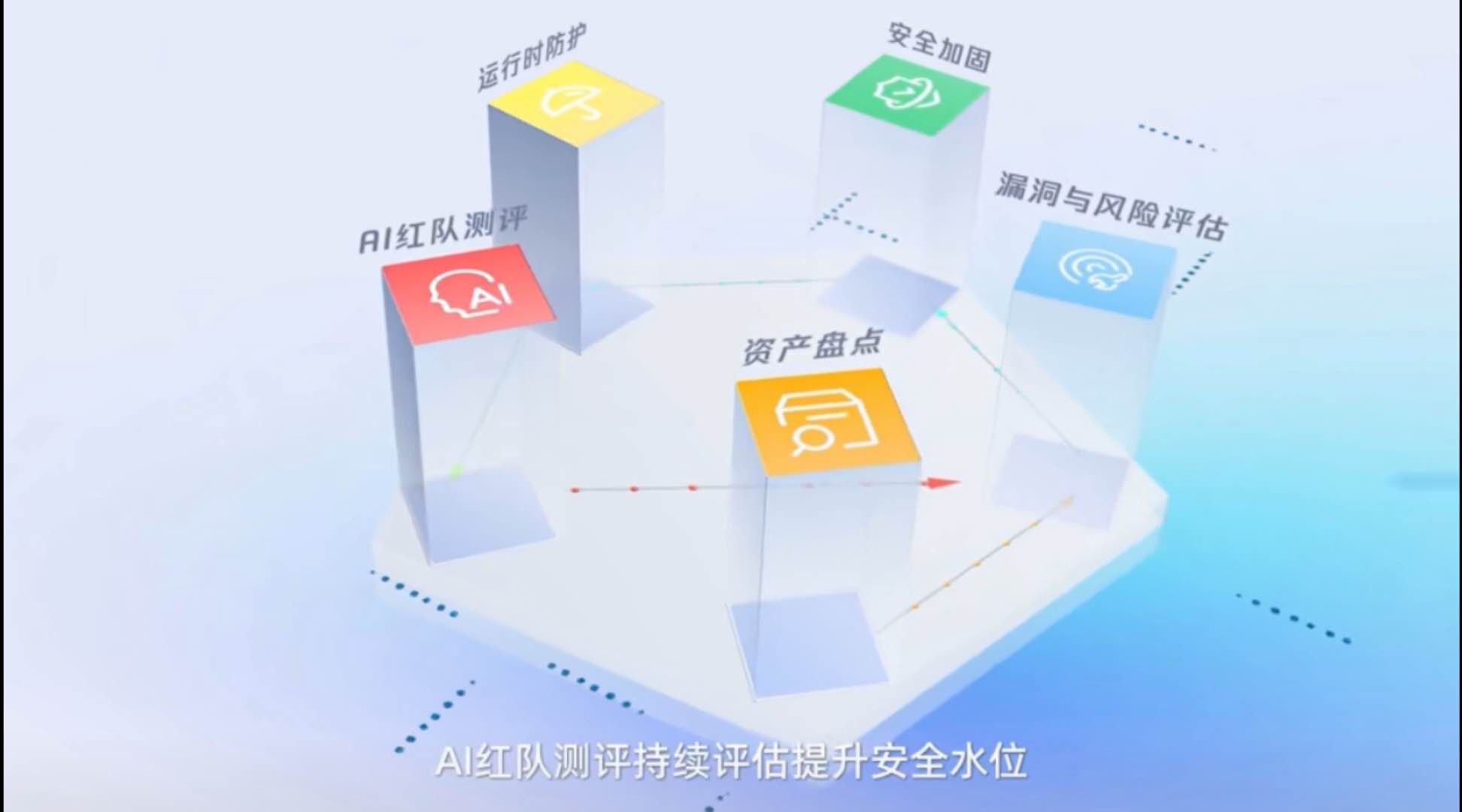 大模型安全测评平台可以通过攻击视角对智能体进行专项「体检」,并结合 TC260 标准,帮助企业完成大模型合规备案与上线。智能体安全管理平台则提供「资产盘点—漏洞和风险评估—加固与持续防护」三方面能力,是国内首个实现对智能体资产风险管理和提示词加固的产品。