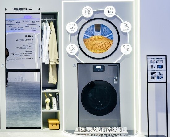 在洗护区域的中心展位, 观众可以近距离感受三星 AI 神 黑钻热泵洗烘旗舰内外兼修的非凡魅力。18kg 洗涤+15kg 烘干的超强承载量、一键操作的 7 英寸 AI 智控大屏, 为全家大件衣物换洗带来省心便捷体验。衣物洗涤方面,AI 洗涤+烘干功能, 能够智能调整水位和洗涤剂的用量, 合理把控浸泡、漂洗和脱水时间及烘干流程。热泵技术则通过抽湿和再热, 使热空气得到持续循环, 深层清洁衣物的同时, 温柔呵护衣物色彩与质感。除菌程序还通过从滚筒底部释放高热蒸汽, 对衣物进行深度卫生清洁, 真正将洗衣、烘干、除菌一机搞定, 把家务化繁为简, 让家人穿衣品质与肌肤健康更有保障。