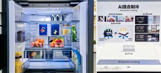 健康与饮食息息相关, 大容量储存与便捷操作之余, 食材的保鲜效果永远是衡量一款冰箱能力的重要因素。储鲜方面, 三星 AI 神 冰箱 9 系搭载的 AI 混合制冷功能, 融合了创新半导体技术与智能变频压缩机设计, 通过高级算法及 AI 智能传感器, 高效提升食材保鲜效果, 同时更加节能, 将食材保鲜与能耗节省完美兼顾。在此基础上, 冰箱还采用了多维立体冷流设计, 通过立体环绕式制冷, 实现层层均匀送风, 让上层的甜品、零食与下层的果蔬、生鲜均衡保鲜, 极力延长食材的最佳赏味期限, 保障家人三餐四季的饮食健康。