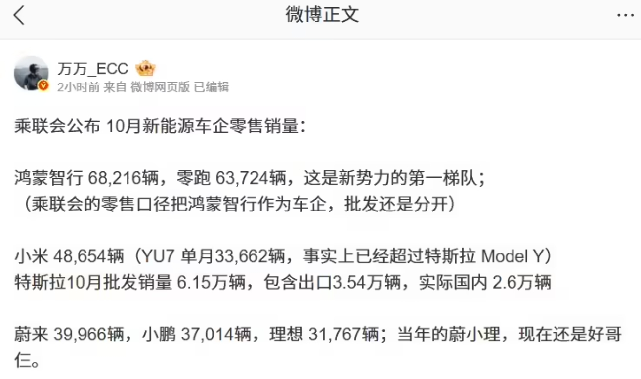 汽车销量数据追踪和分析团队 ECC 情报局的博主 @ 万万_ECC 透露,小米 YU7 销量事实上已经超过特斯拉 Model Y,因为特斯拉 10 月批发销量 6.15 万辆,包含出口 3.54 万辆,实际国内 2.6 万辆。