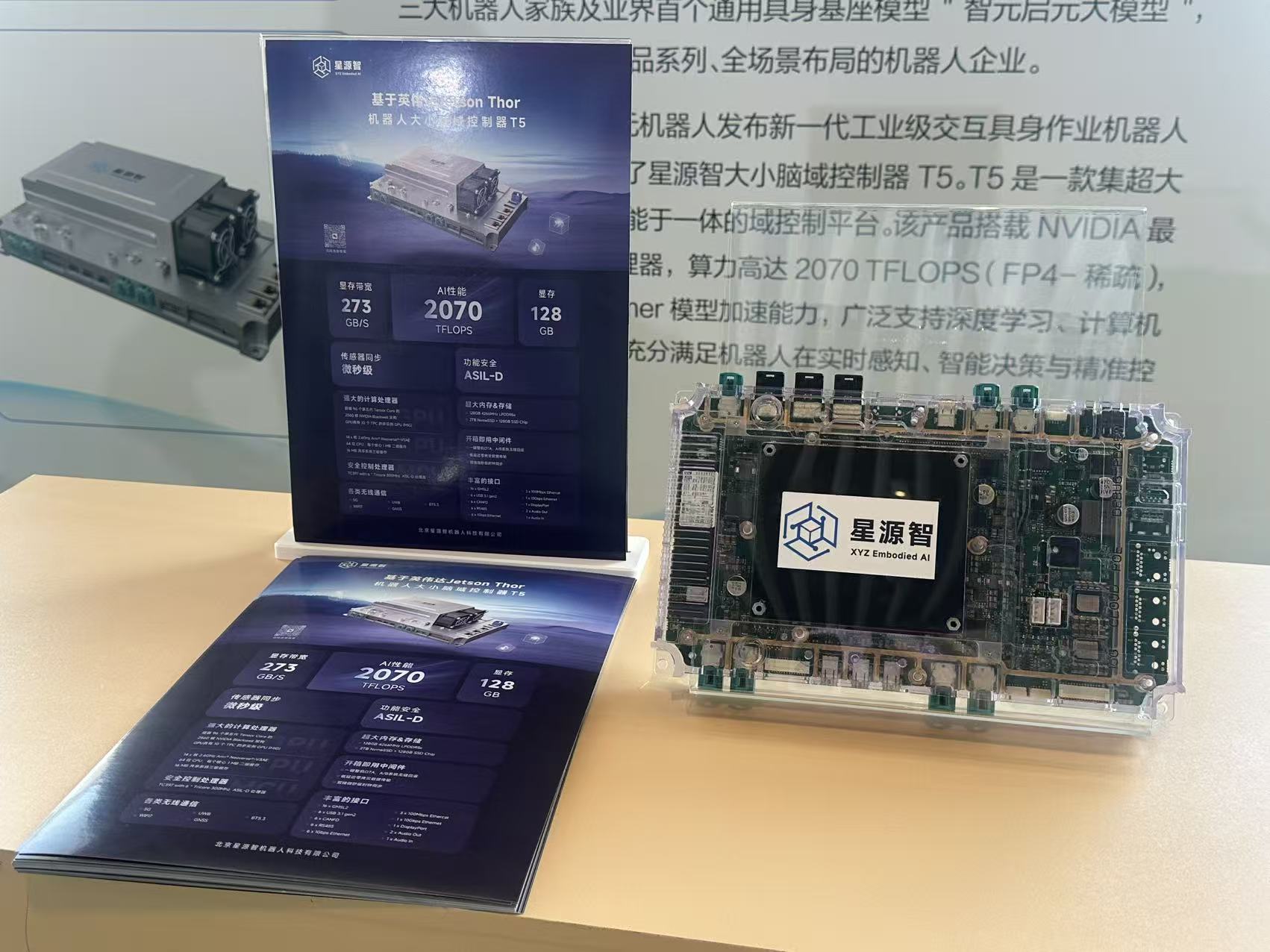 11 月 13 日,星源智携自主研发的机器人大小脑域控制器 T5 登陆百度世界大会 2025。作为一款集超大算力、低功耗与高性能于一体的域控制平台,T5 搭载 NVIDIA 最新 Jetson Thor 处理器,算力高达 2070 TFLOPS,具备大型 Transformer 模型加速能力,广泛支持深度学习、计算机视觉等先进算法,可充分满足机器人在实时感知、智能决策与精准控制方面的需求。
